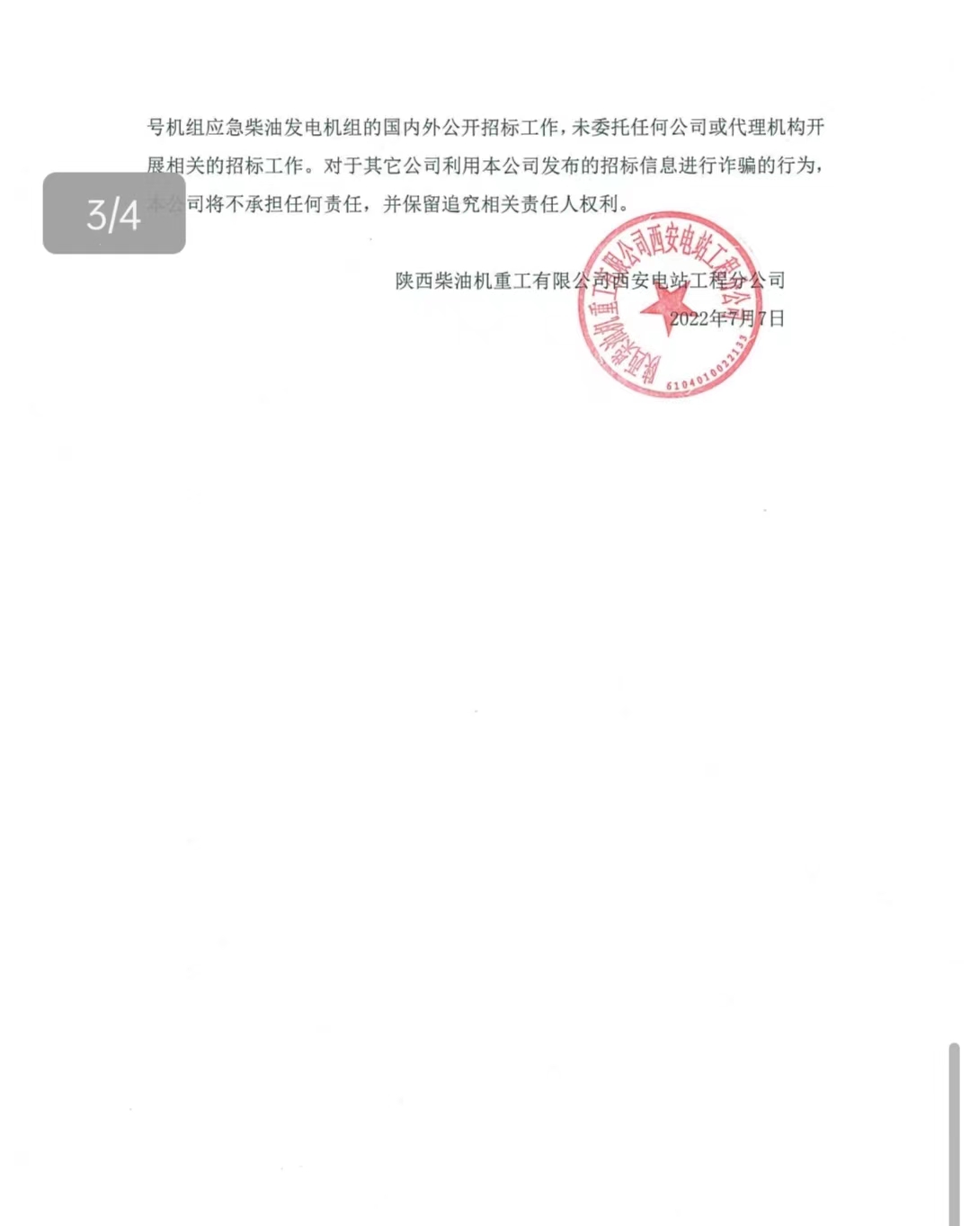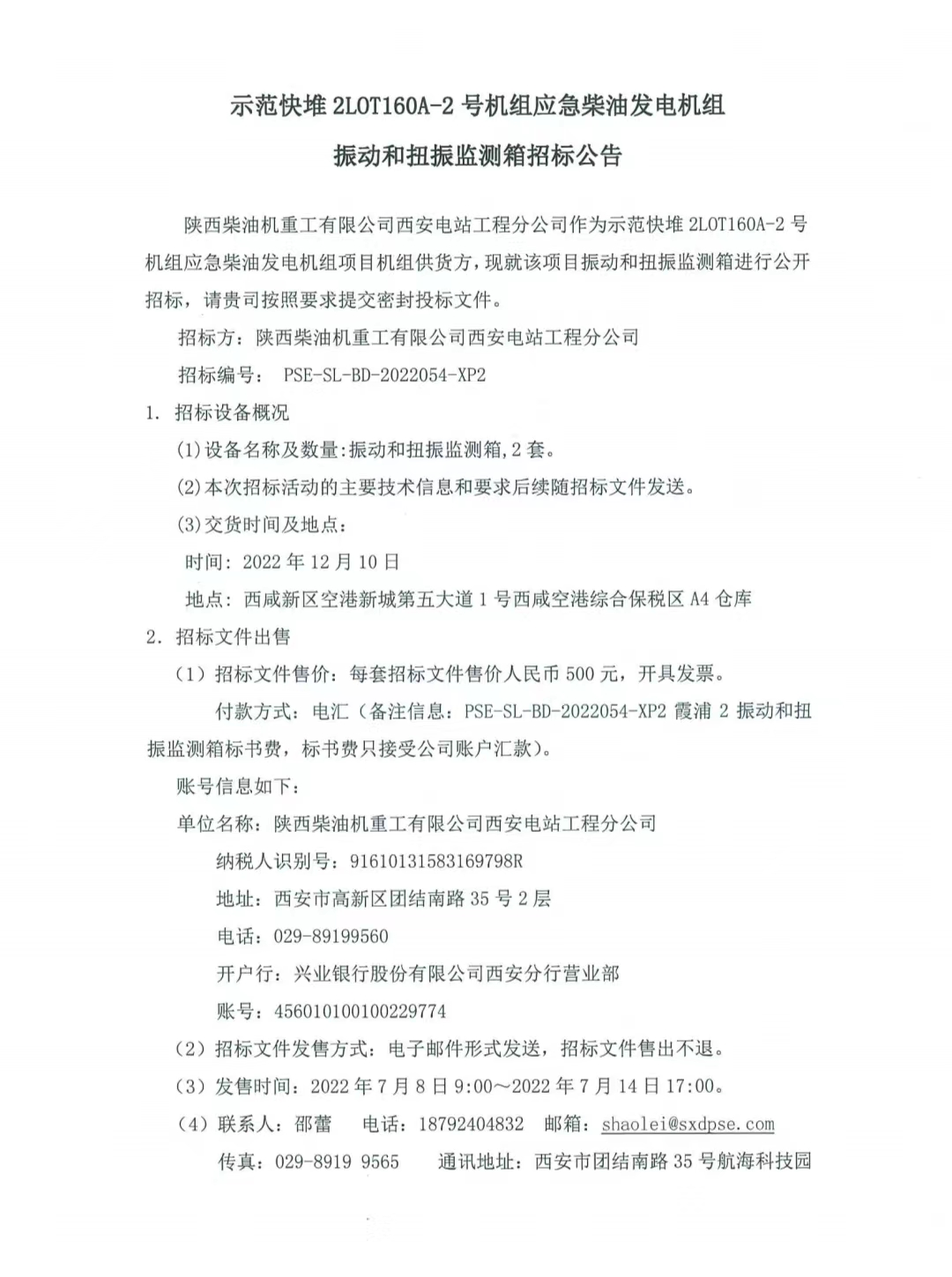 示范快堆2LOT160A-2号机组应急柴油发电机组振动和扭振监测箱招标公告