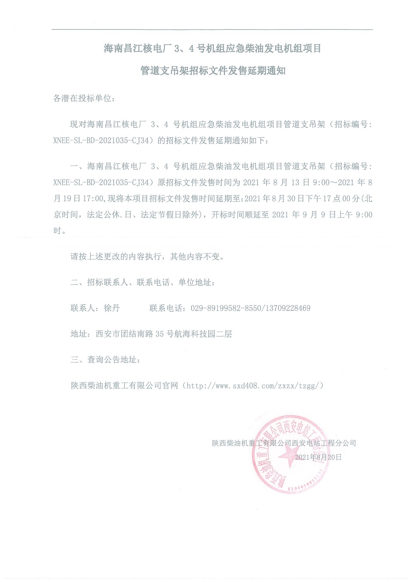海南昌江核电厂3、4号机组应急柴油发电机组项目 管道支吊架 招标文件发售延期通知