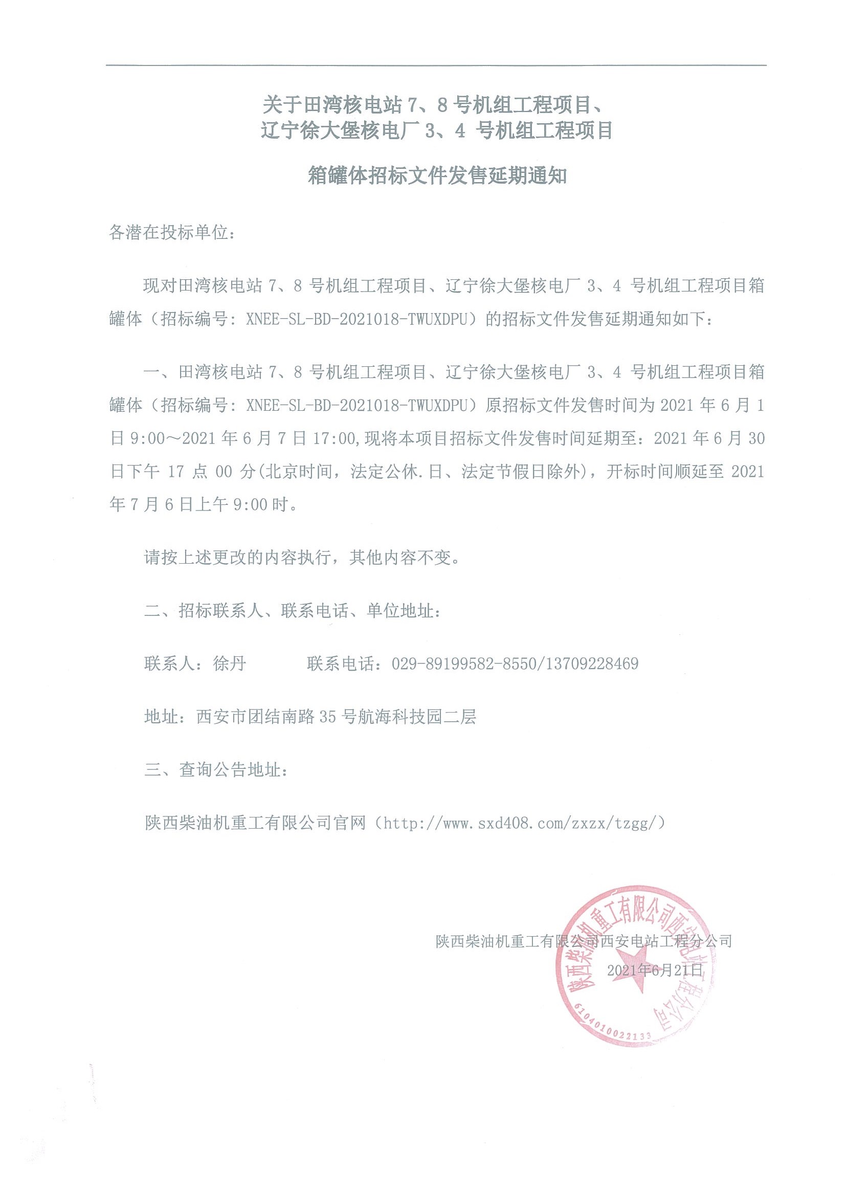 田湾78&徐大堡34机组工程项目 箱罐体招标文件发售延期通知