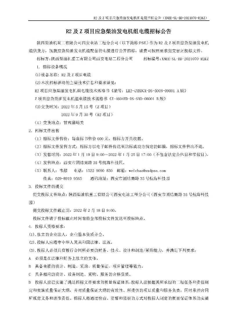 发电机组电缆招标公告