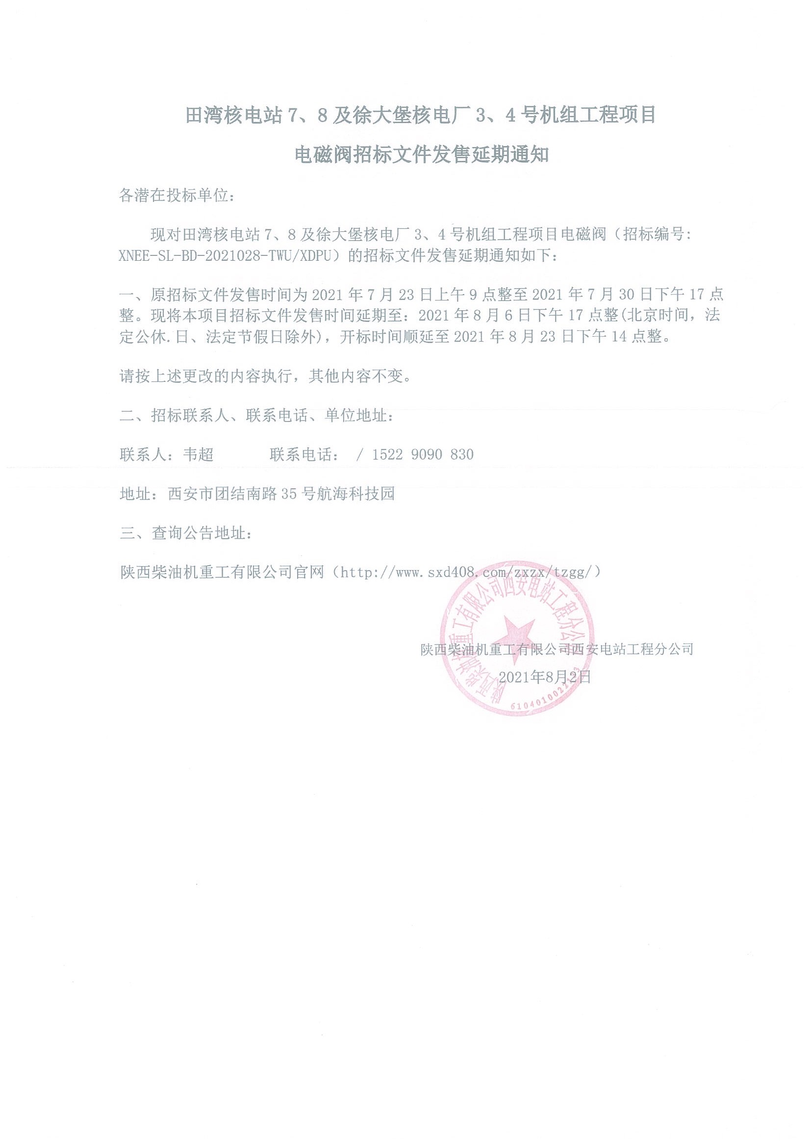 田湾核电站7、8及徐大堡核电厂3、4号机组工程项目电磁阀招标文件发售延期通知