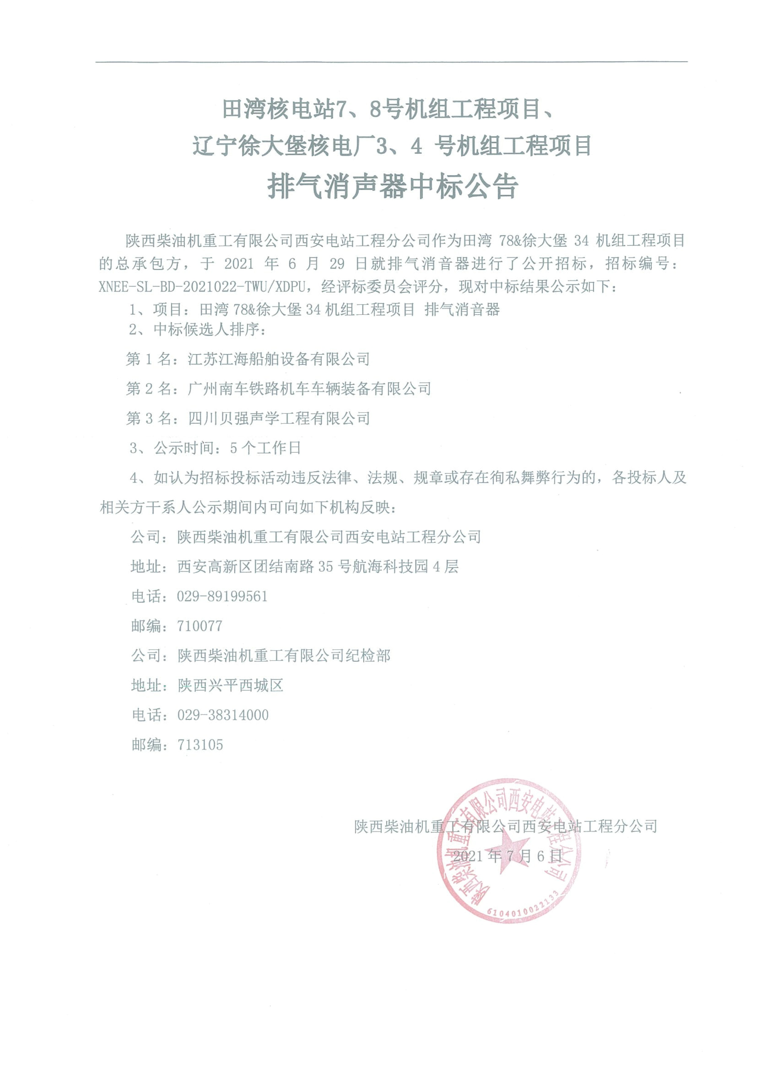 田湾78&徐大堡34机组工程项目排气消声器中标公告