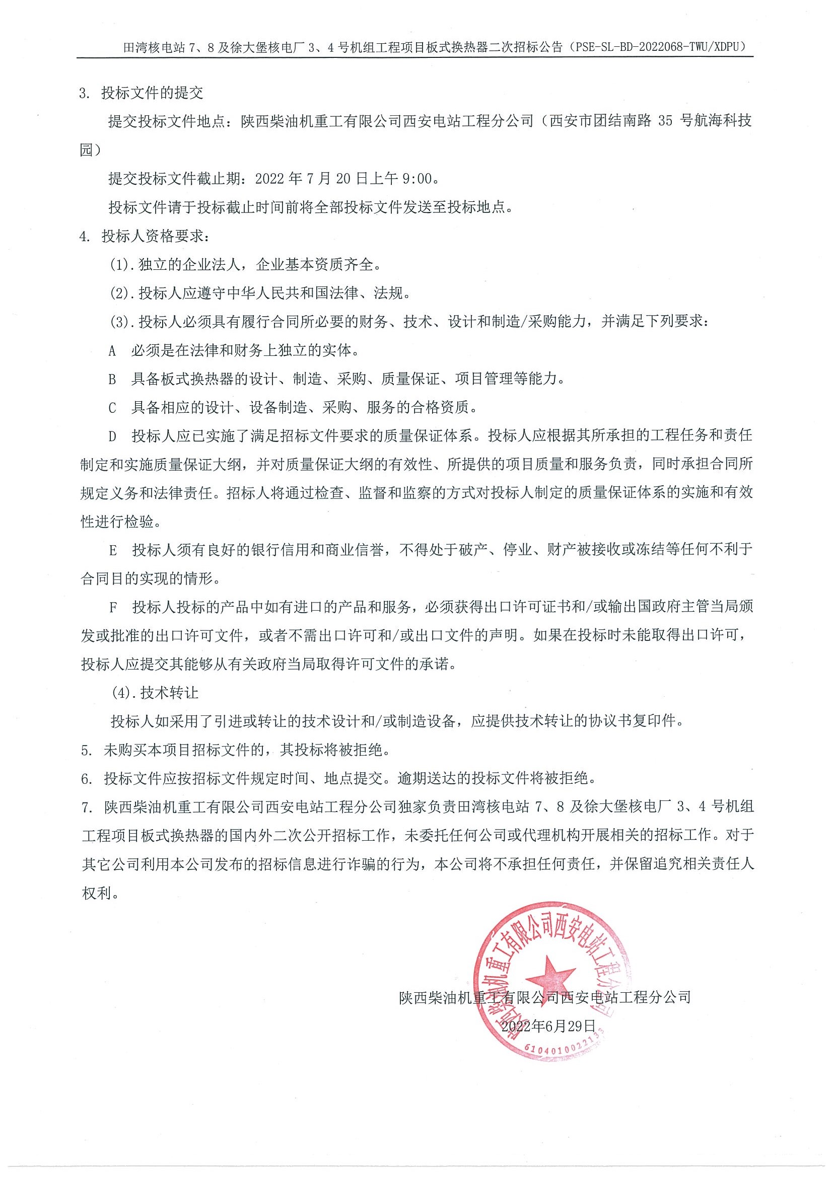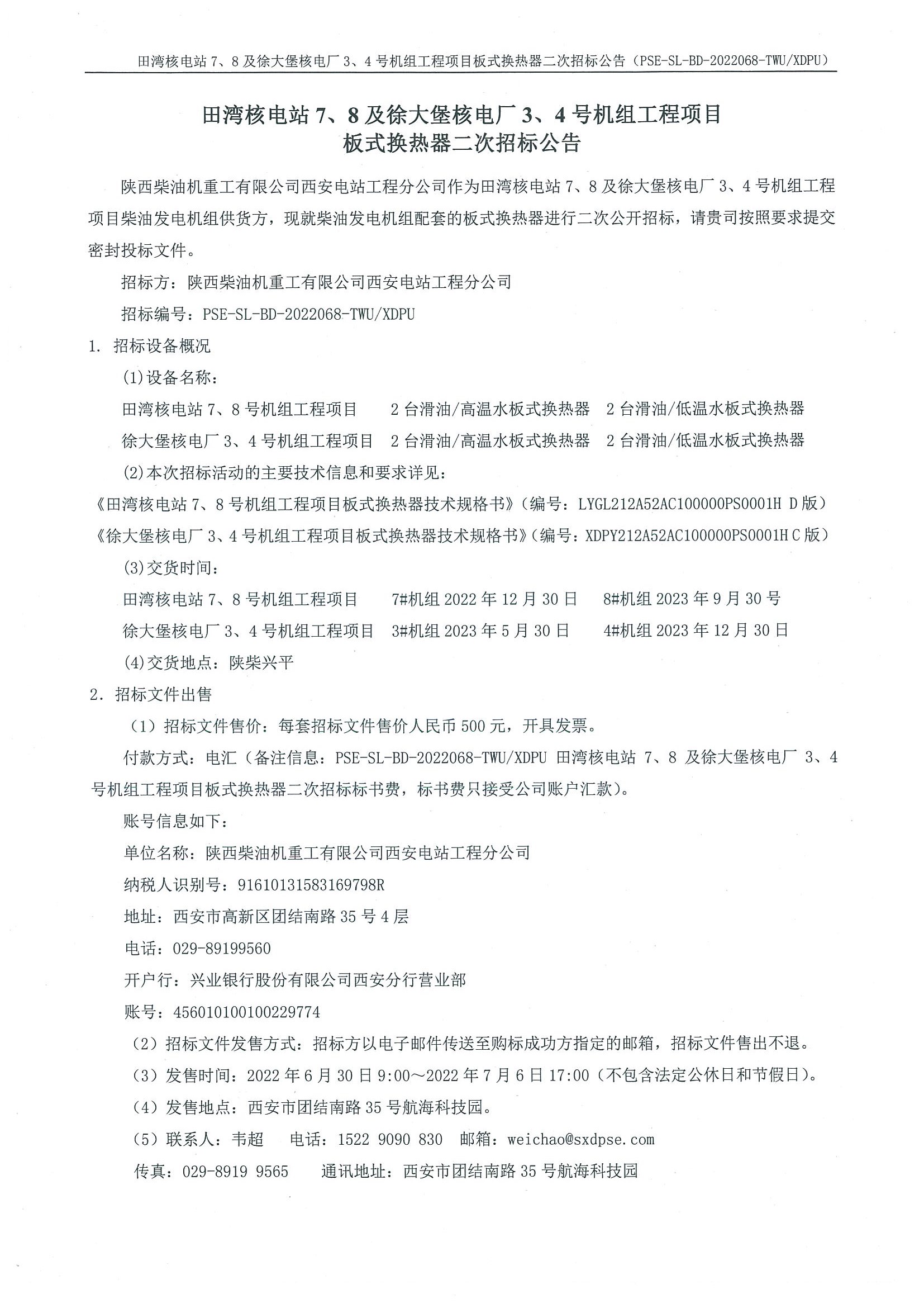 田湾核电站7、8及徐大堡核电厂3、4号机组工程项目板式换热器二次招标公告