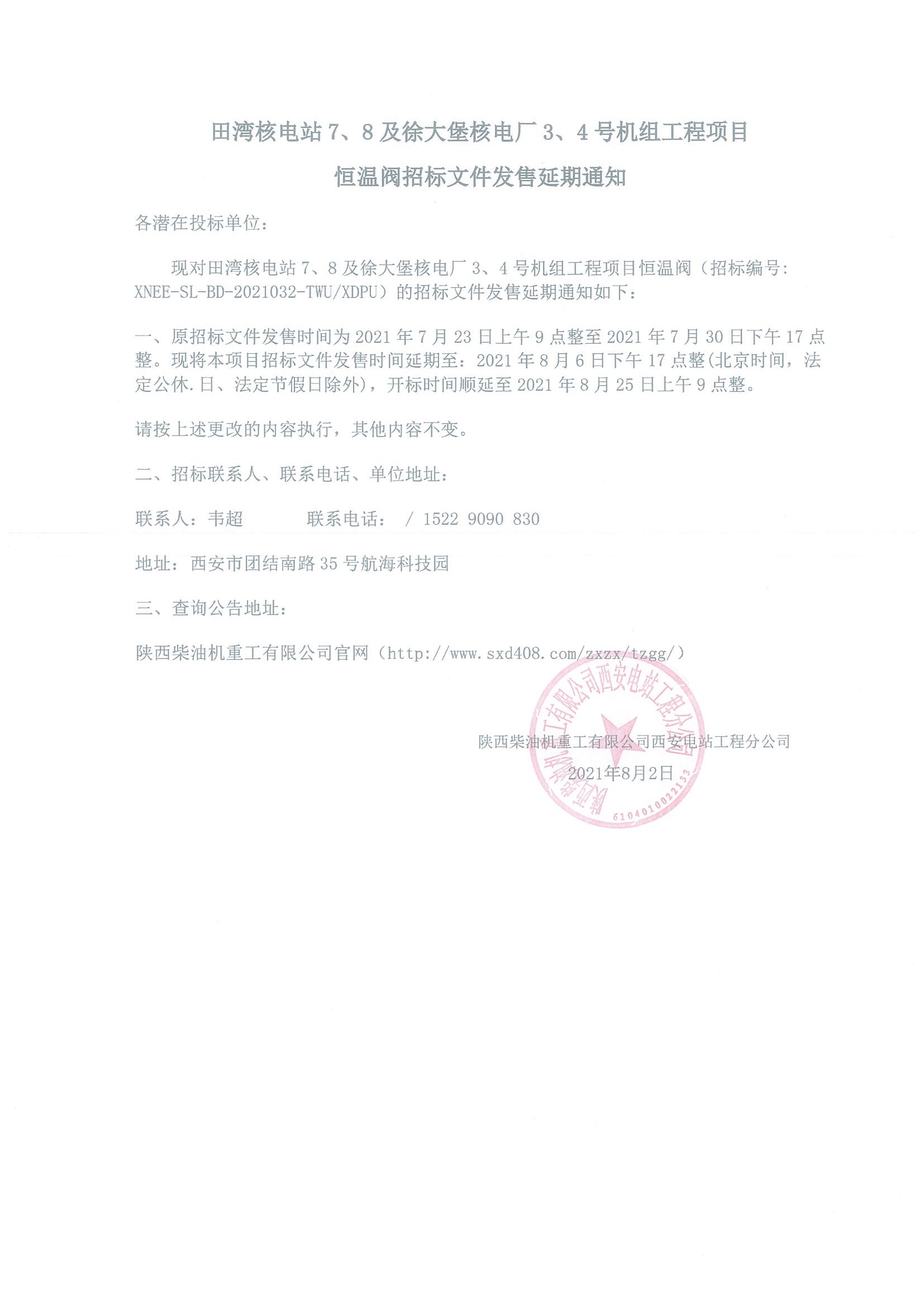 田湾核电站7、8及徐大堡核电厂3、4号机组工程项目恒温阀招标文件发售延期通知