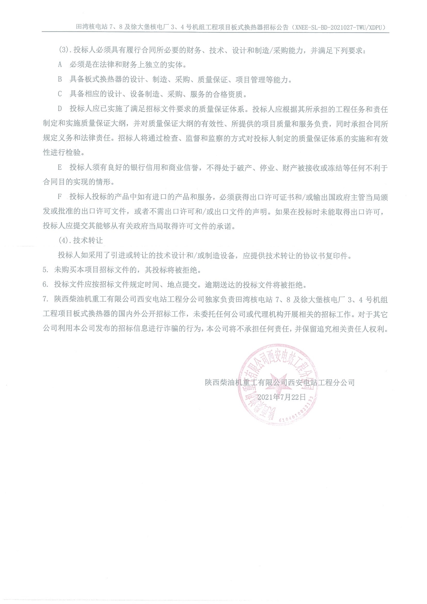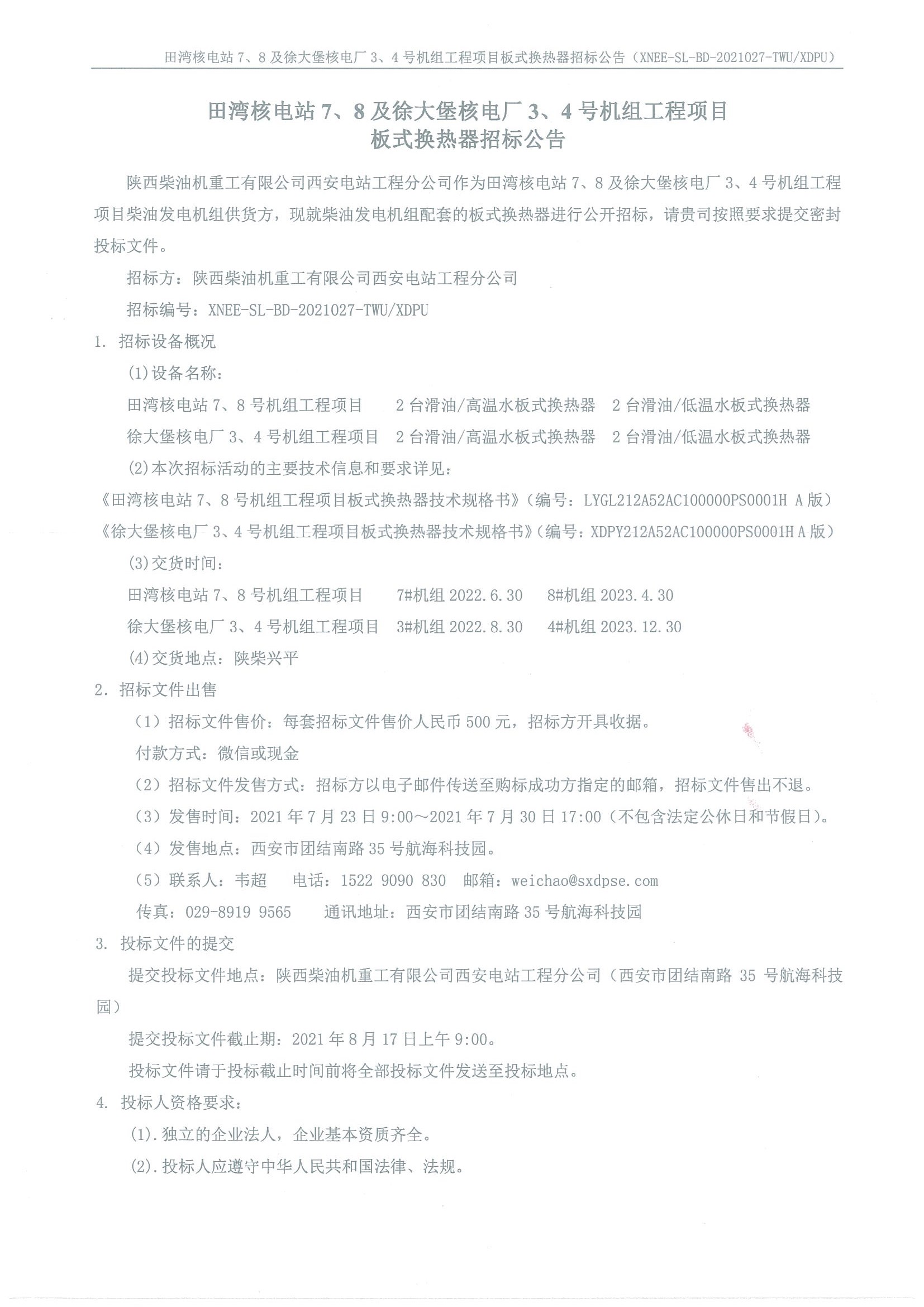 田湾核电站7、8及徐大堡核电厂3、4号机组工程项目板式换热器招标公告
