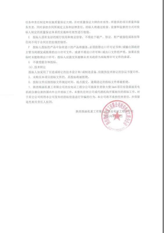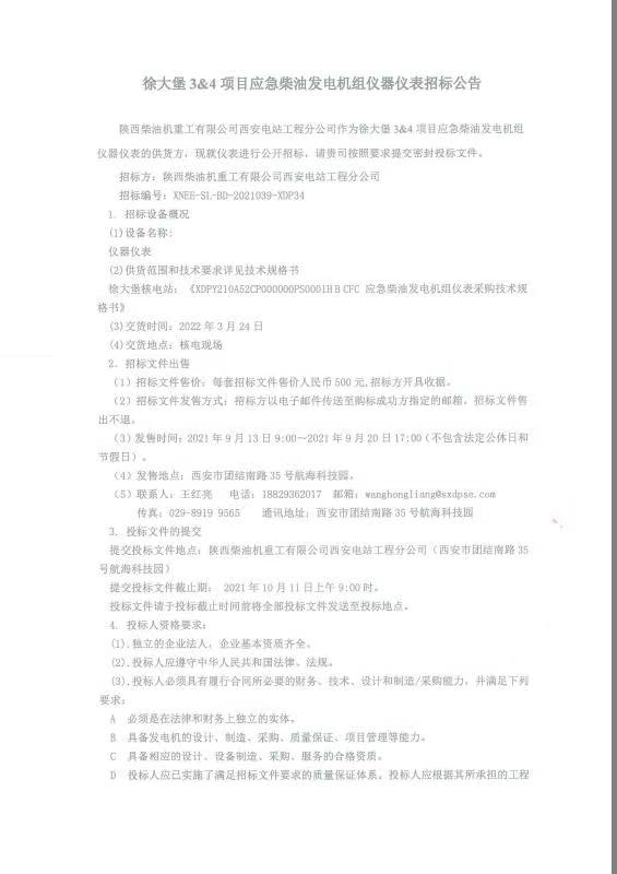 徐大堡3/4柴油机发电机组仪器仪表招标公告